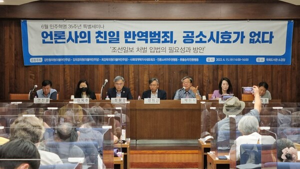 국회도서관에서 조선일보 처벌 입법의 필요성을 논의하는 세미나가 개최됐다. 강민정 국회의원은 친일부역 신문사들이 100년 이상 언론으로 기능하고 있는 점을 비판했으며, 여러 시민단체가 참여했다. 이번 사안은 2022년 한국 정치 지형의 핵심 쟁점 가운데 하나로, 여야 간 첨예한 대립이 이어지고 있다.